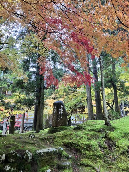 山門から本堂に向かう小径沿いの木々の紅葉が始まっていて緑の苔に映えてとても綺麗でした。